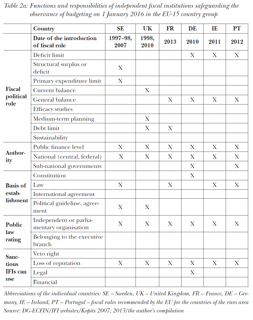 - 7 As regards the constitutional rating of institutions overseeing the observance of relevant rules, independence from the government is a generally prevailing requirement, although we see Poland as the “odd one out” where the institution was established as part of the executive power. A well-known consequence is loss of reputation/credibility as a sanction applied by fiscal institutions. In the case of Poland we can see the option of legal sanctions (for example the renegotiation of the budget), while financial sanctions (for example, the suspension of EU resources) can be used in the countries of the euro area (Franco, 2011).