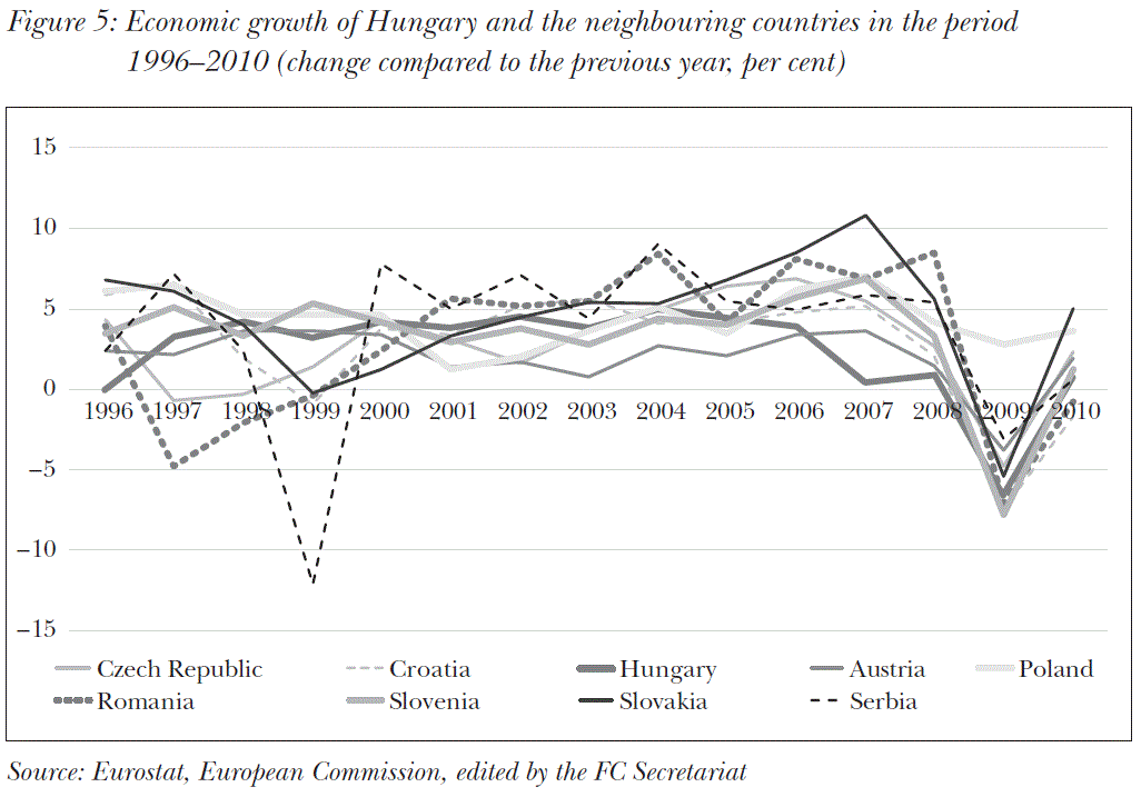 The aforementioned reasons appearing in Hungary together with a number of other factors, like ever-decreasing productivity, led to a more moderate growth, and occasionally even to recession, compared to the neighbouring countries, and the level of growth could only be maintained by the continued involvement of external sources i.e. indebtedness (see Figure 5).