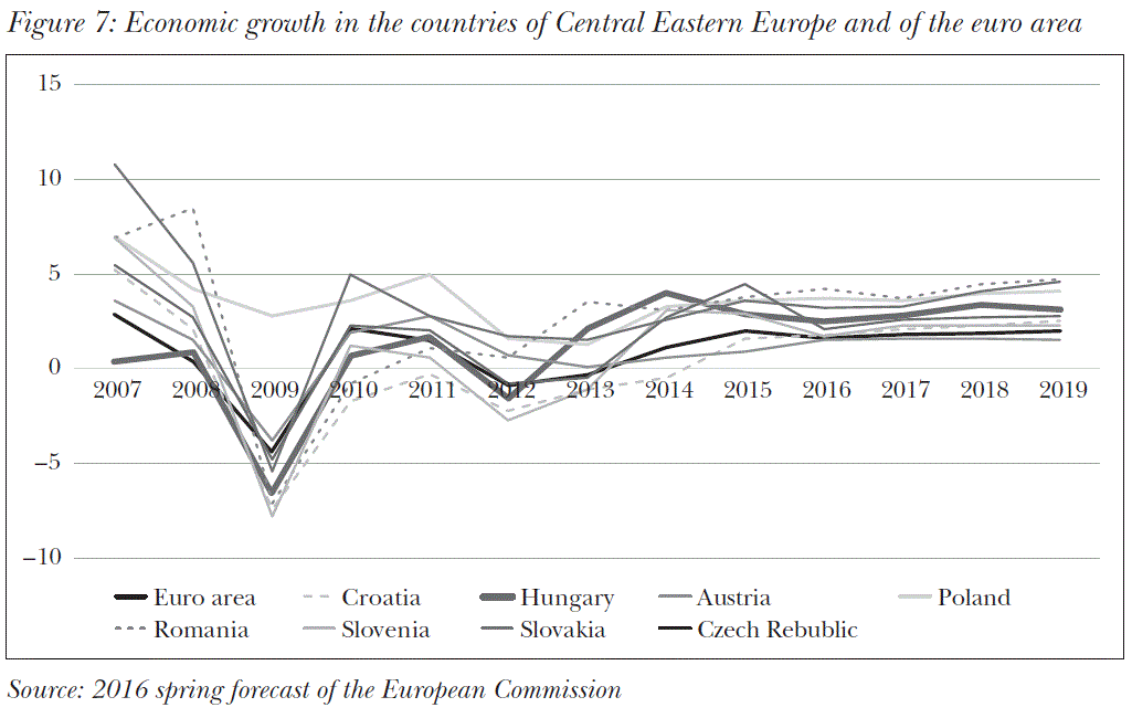 Growth determining the stability of the country and public finances has been present since 2013. It should be stressed that “the years of 2014 and 2015 were the first two years, ever since the early 1990s, when the Hungarian economy was able to grow without being followed by the growth of government debt and the external debt of the economy” (György–Veres, 2016:380). It is auspicious that economic activity has strengthened and that economic growth in the region exceeds the average of the euro area (see Figure 7).