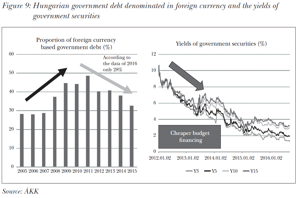 In the first half of the 1990s and then, following a temporary decrease, in the 2000s, the country was heavily burdened not only with the paying back of the soaring government debt but also the very expensive financing of the debt (debt service, i.e. the interest rate). “In the period of 1993–1999 in Hungary the expenditure on interest exceeded the expenditure on education, culture and health care” (György–Veres, 2016). To this we can add that, even in the years following 2010, servicing the debt tied up the same amount – i.e. 8-9 per cent – as that used for financing health care and was scarcely less than the 10–11 percent dedicated to education.