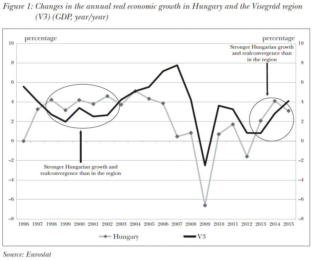 To fully understand the analyses and the proposals in particular set forth in the volume it is worth looking back to the recent events in the Hungarian economy and economic policy. At the beginning of the 2000s the competitive advantage of Hungary, a country considered number one in the region, had diminished to zero by the end of the 2000s as a result of the irresponsible economic policy and the wrongly structured economic model. Consequently a fundamentally weakened economy had to face the global financial and economic crisis; which economy had already been lagging behind the region by that time. Following the transformation crisis after the political transition Hungary had exhibited a relatively dynamic convergence until the beginning of the 2000s, and as a result the country held a strong position in the region (Figure 1). Subsequently, however, the Hungarian national economy – in spite of the favourable global real economic activity – fell behind the competitors in the region gradually, which is attributable to the applied unsustainable economic model that was fundamentally wrong in its structure and was based on external indebtedness.