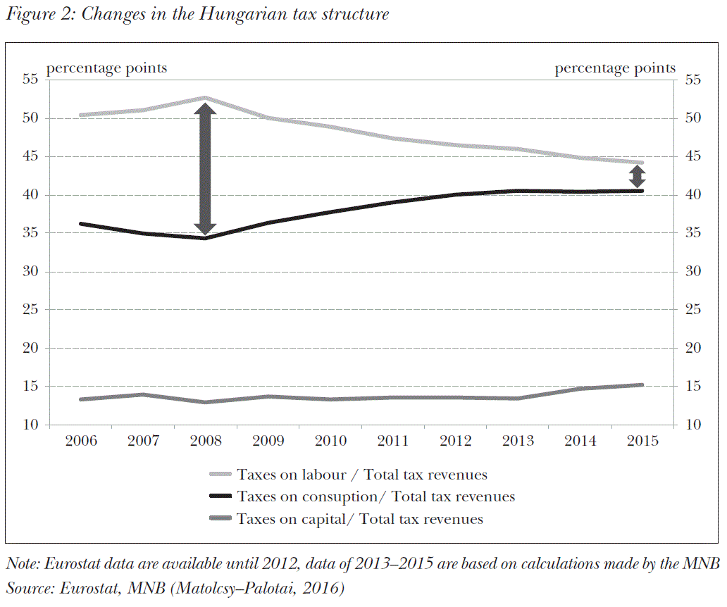 It is possible to achieve labour market activity and the increase of employment within the whole population through such tax incentives as the reduction of taxes on labour. Although as a result of the reform measures after 2010 Hungarian labour market data improved significantly, they are not outstanding in a regional comparison, therefore the volume suggests further measures should be taken in the area. A measure that would stimulate both the demand and the supply side of the labour market is the reduction of taxes on labour. According to the literature and the recommendations by international organisations (European Commission, IMF, OECD, World Bank) in addition to taxes on capital taxes on labour have a truly harmful and distortive effect on the economy. For this reason it is widely agreed that the transformation of the tax structure is more effective if the balance of tax centralisation is shifted from the taxes on labour to the taxes on consumption that have a less distortive effect. Such a change in the structure lessens the distortive effects taxation has on the economy, it promotes formalising the economy, increases employment, real growth and improves competitiveness over the long term (OECD, 2010). After 2010 the fiscal policy has been following down this path (Figure 2). For example the introduction and the reduction of the flat rate, proportional personal income tax (PIT), – through an increase in net wages – promoted the labour supply on both the extensive and the intensive margins, and it lessened the willingness to underreport income both on the employer’s and the employee’s part. The MNB’s volume supports further cuts of the personal income tax. Moreover, burdens imposed on labour will be reduced by the targeted exemptions of employer’s social security contributions implemented earlier within the framework of the Job Protection Action Plan ( JPAP) that supports 850–900 thousand employees. The volume also makes a proposition to increase these and to extend the exemptions to more employees. The government decision made in November 2016 fits in this path of tax policy that stimulates competitiveness. According to this, in 2017 employer’s social security contributions will decrease significantly from 27 per cent to 22 per cent. Moreover, they will fall further by 2 or 2.5 percentage points in 2018, which may continue in 2019–2022 depending on wage growth. In addition the minimum wage and the guaranteed minimum wage will increase from HUF 111,000 to HUF 127,650 and from HUF 129,000 to HUF 161,250 in 2017 respectively (in 2018 another 8 and 12 per cent increase may be expected). Mutually reinforcing one another, these measures stimulate willingness to take jobs significantly, and may contribute to reduce labour shortage in several settlements and sectors.