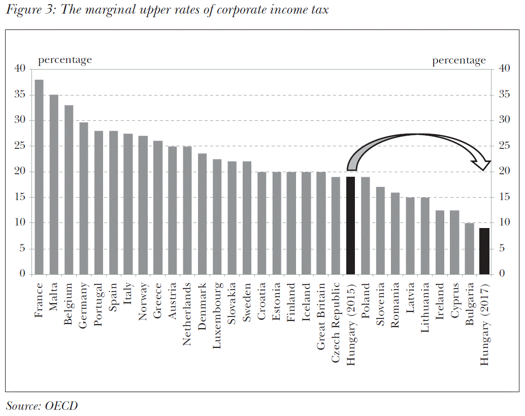 Another key factor of creating competitiveness and persistently dynamic real economy convergence is the permanent and yet developed availability of physical capital. From the perspective of competitiveness and further progress the rate of capital accumulation of the corporate sector and its structure are important factors. Basically stability and profitability are required for corporate creditability, which can be supported through the tax system in a number of ways. According to the volume one instrument to achieve this can be the creation of a tax system that promotes productive private investments. In addition, corporate profitability and capital accumulation are supported by the reduction of corporate tax (as income tax) or the simplification of its payment (IMF, 2016), as well as through approaching the corporate income tax towards cash-based taxation. The latter has not been announced, but the former has: the so far progressive – with rates of 10 and 19 per cent – corporate income tax (CIT) is expected to become a flat rate and single-digit system in 2017 (9 per cent, which in turn will be the lowest corporate income tax rate in the European Union), and the conditions to access simplified and preferential small business taxation forms (kata, kiva) will be made easier in 2017, therefore they become accessible for more. In addition, the volume offers setting up a competitive guarantee organisation and the more effective utilisation of EU funds as a proposal, which may promote availability of loans to SMEs from both the demand and the supply side. This might increase employment and economic competitiveness over the short term. The reduction of regulated energy prices is also mentioned in the volume, which has only been introduced in the household sector so far.