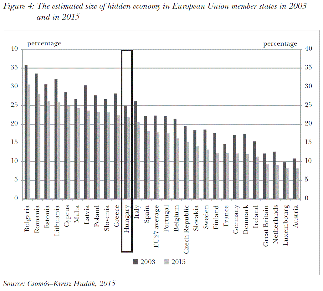 The quality of accumulated physical capital, and the effectiveness and productivity on corporate and macro-economic level can be improved significantly by increasing the expenditures of corporations on research and development (R&D). In this respect Hungary is doing relatively well compared to other competitors in the region; however, its performance is below the average in the European Union. Corporate trainings and spreading research cooperations between universities and corporations may provide an effective tool to improve this (EC, 2016). The volume also suggests increasing the number of researchers and developers in a way that would extend the benefit for researchers and developers available in social contribution tax to researchers with university degrees employed in research bases in the corporate sector. The authors point out that in addition to this the innovative capacity of the SME-sector would need to be increased, because the proportion of corporations with successful innovation activity in Hungary is far below the average in the European Union. To close the gap created by this competitive disadvantage the volume proposes setting up non-profit counselling centres as an effective instrument following the English example. A greater proportion of state support provided for R&D activities can be achieved through providing more significant government subsidy to the training of students majoring in the field of science and technology. Research and development can be supported by direct instruments and on the state side. Reducing tax evasion may have a favorable effect on corporate innovation, which has a positive effect on potential growth through the improvement of productivity (Bobbio, 2016). Tax evasion distorts market competition and the effective allocation of capital, damages fiscal positions, and decreases the social, legal and financial security of employees. With regards to the estimated value of tax evasion as a percentage of GDP (22 per cent in 2015) Hungary is not far off from the competitor countries either, but it exceeds the average in the European Union a little (17 per cent) (Schneider, 2015).