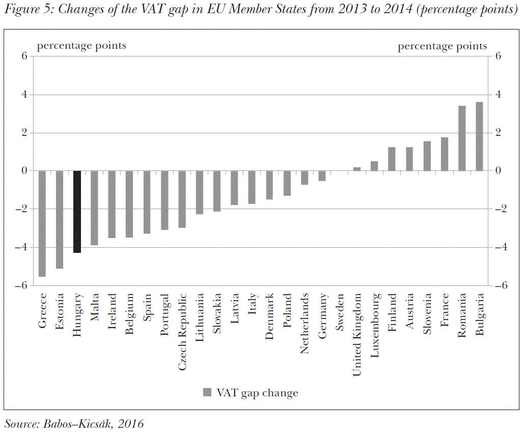 There were several measures created with a view to eliminating the hidden economy in Hungary. As a result, the size of the black economy shrank by more than by 1.5 per cent of the GDP significant budget effect was the connection of online cash registers to the National between 2010 and 2015 (Schneider, 2015). The best-known of these that had the most Tax and Customs Administration (NAV). The number of registers today is close to 200,000, and there will be another 25–30,000 the authority will monitor from 2017. In addition, the introduction of the Electronic Public Road Trade Control System (EKÁER), the targeted VAT-reductions and the application of the reverse charged VAT contributed to the increase of tax revenues from consumption in the past 2-3 years as a result of the reduction of tax rates in numerous cases. These processes and the increase of the estimated implicit VAT-rate by more than 2 percentage points between 2013 and 2015, as well as the steep reduction of the VAT tax gap in 2014 clearly mark the formalisation of the economy (Figure 4). In addition to expanding the group of online cash registers in 2017 the Electronic Public Road Trade Control System (EKÁER) has also been improved since the publication of the volume and the VAT on staple foods will be decreased from 2017 onwards.