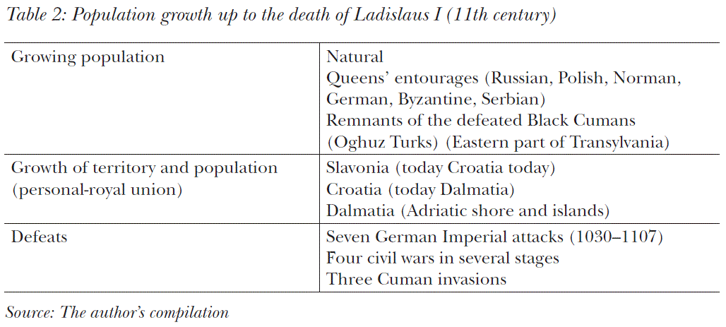 The favourable demographic tendencies of the 11th century were not influenced by its four civil wars (in which the Holy Roman Emperor had intervened), or the defeat of the following: the German Imperial army seven times, of the Oghuz Turks and Cumans three times, the Bulgarians twice and the Polish once. The greatest military leader of the epoch, the first knight-king, Saint Ladislaus (King Ladislaus I) was alone victorious in eleven wars. As his sister’s husband, Zvonimir of Croatia, died without an heir, the majority of the Croatian and Slavonian leaders invited Ladislaus to the throne. In the years 1090 and 1091 he occupied Slavonia peacefully and invaded Croatia and Dalmatia at the expense of small military conflicts. First he made his younger nephew, Prince Álmos, the Croatian king (Table 2), but when his elder nephew, Coloman the Learned, who had been King of Hungary since 1095, had himself crowned King of Croatia in 1102, a personal union was created between Croatia and Hungary. The personal union lasted 800 years without an armed conflict and to the mutual benefit of both nations, until the Treaty of Trianon. A substantial part of the Croatian nobility intermarried with Hungarians and the mixed marriages mutually enriched both nations.