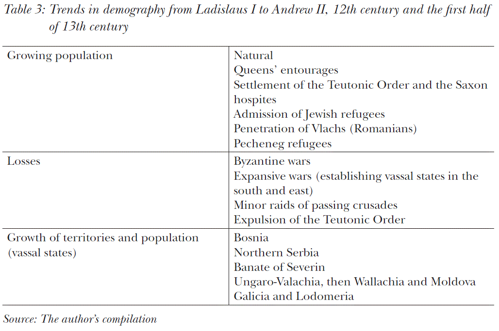 During the reigning of Béla III (1172–1196) and his sons, Hungary again became one of the major powers (in Europe). The revenue of the country equalled that of the French and English kings, and by 1241 the population – 90-95 per cent ethnically Hungarian – was close to two million (Table 3). It was in this situation that the Mongols invaded Hungary. The Mongols defeated the combined armies of the Kievan Rus, the Cumans and other associated, smaller nations near the Kalka River in 1223, and resolved to attack Western Europe; they invaded Kiev in 1240 and conquered the steppe. The fleeing Cumans asked for asylum. King Béla IV took measures to protect the country – the nobles, however, viewed the Cumans as the advance party of the Mongols and chased them out of the country. According to some sources Batu Khan made an offer to Béla IV to attack the Western empires together. Such a force could not have been resisted by anybody up to the Atlantic Ocean. The ‘kindred of the holy kings’ could not accept this offer but, as always throughout its history and even against overwhelming odds, defended Christian Hungary and Christian Europe, the ‘Schengen borders’ of the time. The Mongols invaded from three directions. In the north, they overran the minor Russian principalities, the Polish and Silesia. The southern army troops broke through Bulgaria and Wallachia while the main army swarmed into the country across the passes of the eastern Carpathians. The royal army was lured into a trap and ambushed at the Battle of Muhi in March 1241, the occupied territories were devastated, and the inhabitants massacred. Béla IV did not receive assistance from either the Pope or the Emperor (who were at war with one another) or from any other Western ruler. The available military forces could maintain the line of the Danube until the winter of 1241. After the river froze, the Mongols crossed it and tore along Transdanubia, Slavonia and Croatia as far as Dalmatian Trau (today Trogir), chasing the king, but – most probably due to the election of the Great Khan – they then left the country.