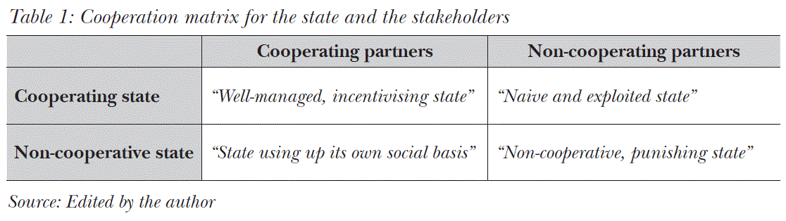 1) cooperative state with cooperating stakeholders: this is the well managed state, with mutual cooperation between the government and the stakeholders (to give an example from the field of taxation: the government levies low taxes and taxpayers have high tax awareness and propensity to pay taxes);