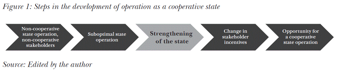 From the right bottom corner of the matrix, representing a suboptimum position, the left upper corner representing the Pareto optimum, can only be reached if state cooperation coincides with cooperation by the partners. This means that in order to achieve the condition of a cooperating state, the state needs to be sure that the response to its cooperative actions will be cooperation instead of a continuation of the previous non-cooperative.7 As a precondition, this requires the reinforcement of the state, as permanent cooperation is only conceivable between equal parties, as a weak state cannot develop a cooperative environment, and only an efficient and powerful state is capable of getting the private sector to permanently cooperate.