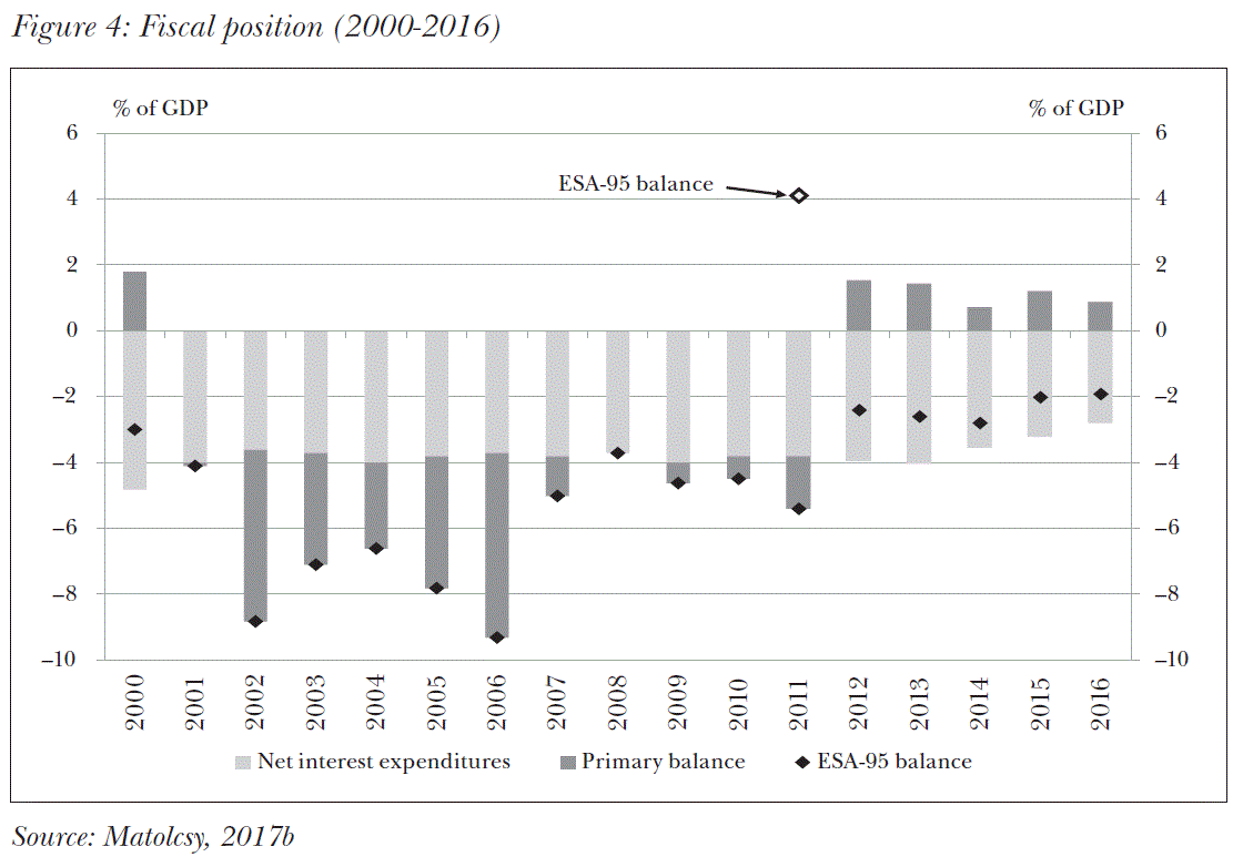 One of the clearest indications of deterioration in Hungarian public finances was the surge in the budget deficit followed by stabilisation at a high level. As a result, Hungary was under the European Union’s Excessive Deficit Procedure between 2004 and 2013. Fixing public finances started during 2010 and 2011, when the balance calculated according to the then valid methodology of the European Union suddenly rocketed to 4% of GDP. After 2012, the budget deficit remained below 3 percent of GDP according to every EU-compatible indicator. Deficit decrease was due to an improvement in the primary balance (net of the interest balance), and to falling net interest costs after 2013.