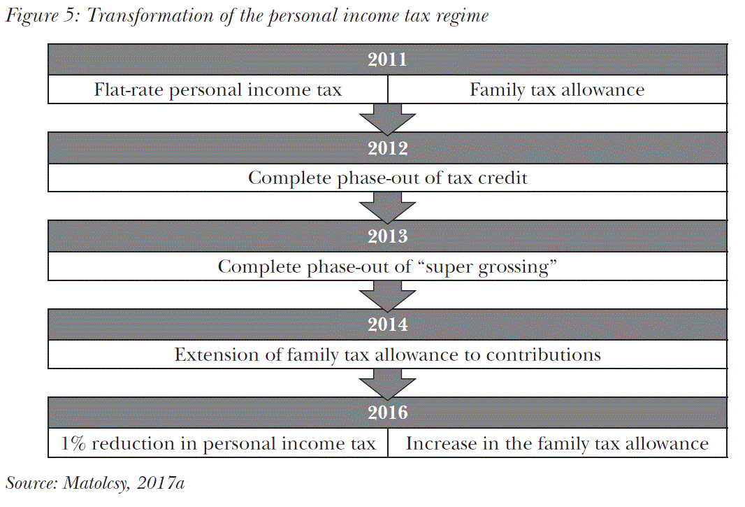 In the above list, special emphasis should be placed on the tax reform, which included, as an iconic step, the transformation of the personal income tax regime, cutting taxes by 2.5 percent of GDP on the whole.11 After the 2011 adoption of a flat-rate personal income tax, the tax wedge fell from the nearly 60-percent measured in 2009 below 50 percent, and thus the Hungarian tax regime partly closed the gap to the international community (Varga, 2017a).