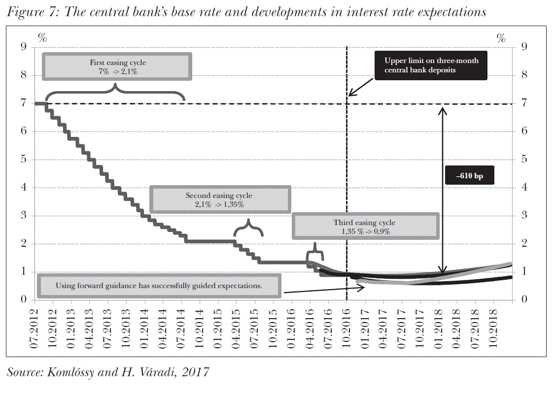 Between 2012 and 2016, the Monetary Council lowered the initial 7 percent central bank base rate to 0.9 percent in three interest rate-cutting cycles, altogether 32 interest rate-cutting steps, and loan rates and money-market yields fell in parallel. Such a long easing cycle and such a low nominal interest rate had been unprecedented in Hungary since the change of regime. At the beginning of the interest cut cycle, inflation was around 6 percent, and from the end of 2013, the inflation started to reasonably decline. Once the 0.9 percent base rate had been reached, the MNB committed to maintain the base rate at a permanently low level.