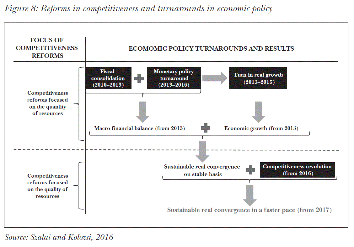 The budgetary and monetary policy turnarounds performed since 2010 have restored the macroeconomic equilibrium required for the improvement of competitiveness, and after 2013, they allowed the economy to grow at a pace exceeding the average of the European Union. The fiscal measurements and the central bank’s actions facilitated economic development19 and increased employment,20 and in addition to the money and capital markets, the achievements of the growth-oriented economic policy are recognised by the international organisations and large credit rating agencies. However, a faster and permanent convergence requires an improvement in the qualitative attributes of resources. For an escape from the medium-developed economy status, the acceleration of convergence is indispensable, and requires reform actions performed with primary focus on the quality criteria of competitiveness. In order to preserve the achievements made since 2010 and accelerate permanent convergence, it is indispensable to make efforts at improving efficiency and increasing value creating capacity and productivity (turnaround in competitiveness). In order to regain Hungary’s former regional leading position and to break free from the trap of medium development, the gap must be closed more rapidly than previously and the exploitation of the growth pattern needs to be carried on and improved.