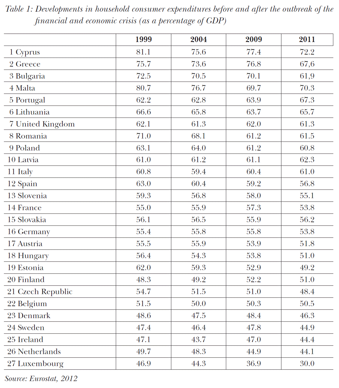 In the past decade, the contribution of household expenditures to GDP at any time fell or at most stagnated in several countries. As GDP also declined in several countries due to the crisis, in these countries this meant a decrease in household expenditures in real terms. The most conspicuous decline in household consumer expenditures to GDP was recorded in Luxembourg (10.5%), Malta (10.4%), Estonia (10.1%), Romania (9.8%) and Cyprus (8.9%) (Eurostat, 2012).