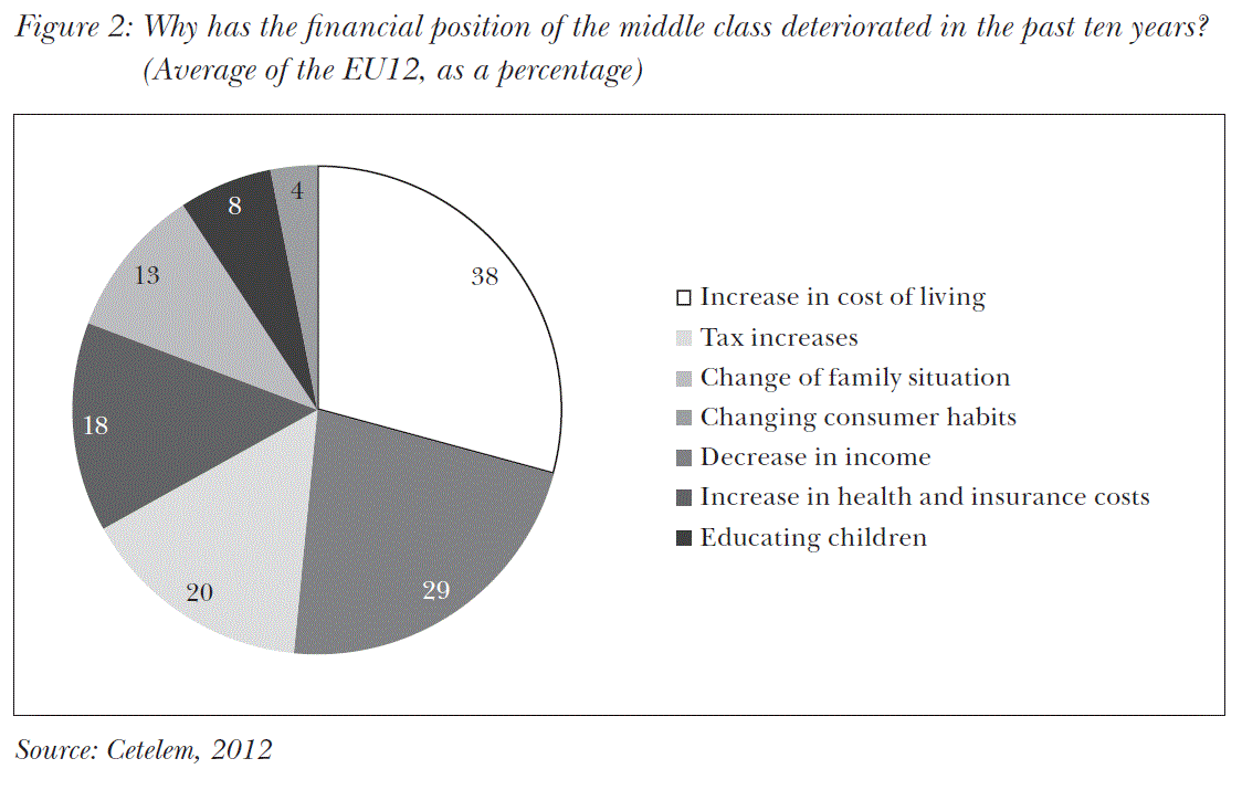 Most respondents mentioned the considerable increase in the costs of living and fall in incomes as the most significant factors in the deterioration of their financial position. Income reduction is less perceptible in Italy and France, however, rise in the costs of living was mentioned in the first place in 11 of the 12 surveyed countries and in the second place in one (it ranked second in the Czech Republic, where it slightly preceded by reduction in incomes). Whether the various daily price hikes (food, fuel, transport, etc.) or rises in the basic costs (rental, overhead, water supply, sewage, electricity, natural gas, telephone, etc.) are taken as a basis, currently they put higher pressure on middle classes as well as wage- and salary-earners because incomes fail to rise as rapidly as costs. In a decade, the ratio of spending on residence, overhead costs, insurance, telecommunication, health and education linked to household budgets rose from 28 to 33 percent (Cetelem, 2012, p. 26).