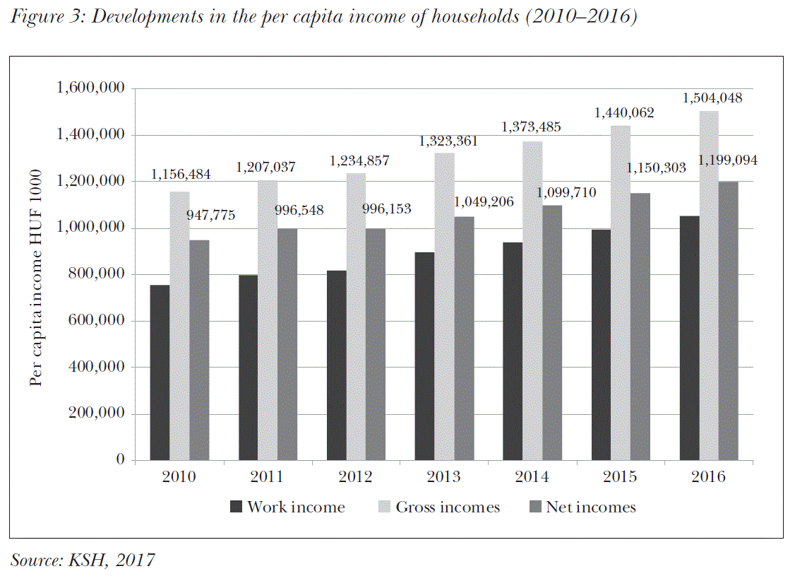 Household incomes are composed of three major types of incomes: income from work, social allowances and other income. The higher the ratio of income from work, the more favourable the income structure is. Since 2010, the ratio of income from work has increased from 65.3 to 70.1 percent on average (KSH, 2017).