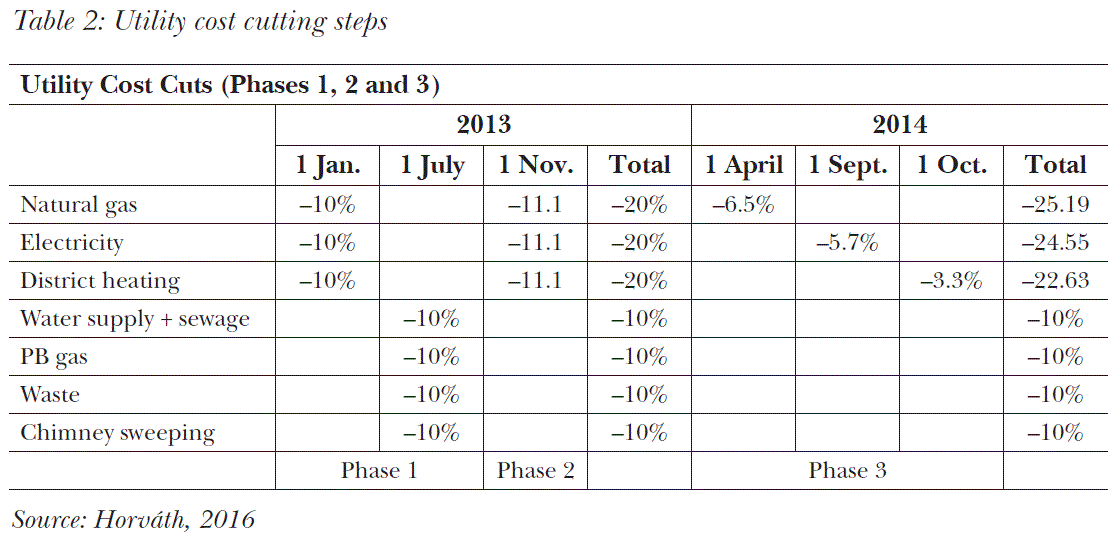 The first phase of utility cost cuts started on 1 January 2013. The price of natural gas, electricity and district heating was reduced by 10 percent, and this action was followed by proposals and actions for similar cuts in household PB gas, waste disposal, water supply, sewerage and chimney sweeping fees. On 29 April, the National Assembly codified utility cost cuts in law (Act LVI of 2013).