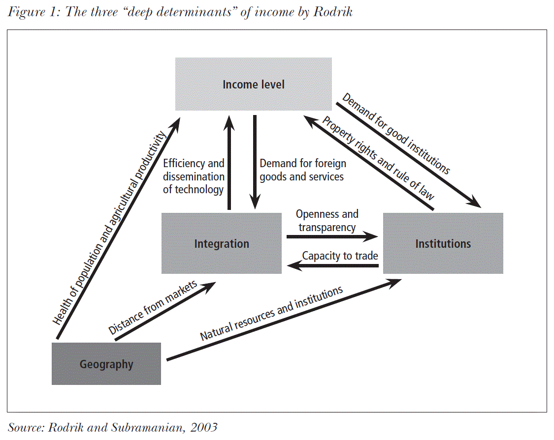 In their research Dani Rodrik and Arvind Subramanian identified three “deep determinants” of income: geography, integration and institutions (see Figure 1) and found that the “quality of institutions overrides everything else” (Rodrik and Subramanian, 2003, p. 31). Institution is defined as by Lin and Nugent, quoted by Rodrik: “It is useful to think of institutions broadly as a set of humanly devised behavioural rules that govern and shape the interactions of human beings, in part by helping them to form expectations of what other people will do” (Lin and Nugent, 1995, pp. 2306-2307; Rodrik, 2000, p. 4). Rodrik adds: “All well-functioning market economies are ‘embedded’ in a set of non-market institutions, without which markets cannot perform adequately” (Rodrik, 2000, p. 4).
