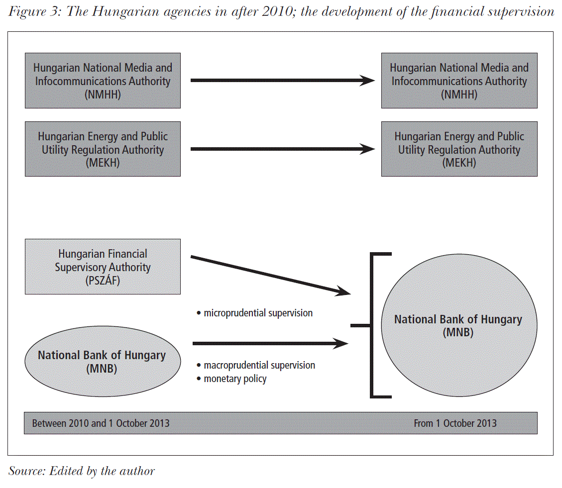 In accordance with the provisions of the new MNB Act, PSZÁF ceased to exist as an independent organisation and merged into the MNB with effect from 1 October, 2013. The MNB has taken over the objectives and competences of PSZÁF with immediate effect upon the merger. For our purposes this means that according to Fazekas’s definition of “agency”, the MNB qualifies as an agency. In terms of the institutional model, the MNB embodies all four institutional categories.