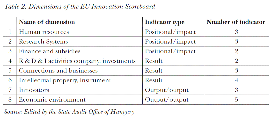 The European Union, to measure the effectiveness of R&D and innovation, created a complex indicator system comprising 8 dimensions, within that 25 ratios and the summarized value of all provides an index number, which evaluates the results of R&D and innovation. To be consistent and comparable, it uses a unified, statistic based set of data specific to R&D and innovation activities. The content of each ratio (indicators) is clearly defined. The reliability is ensured by the use of data solely provided by the statistical offices of the Member States of the Union.