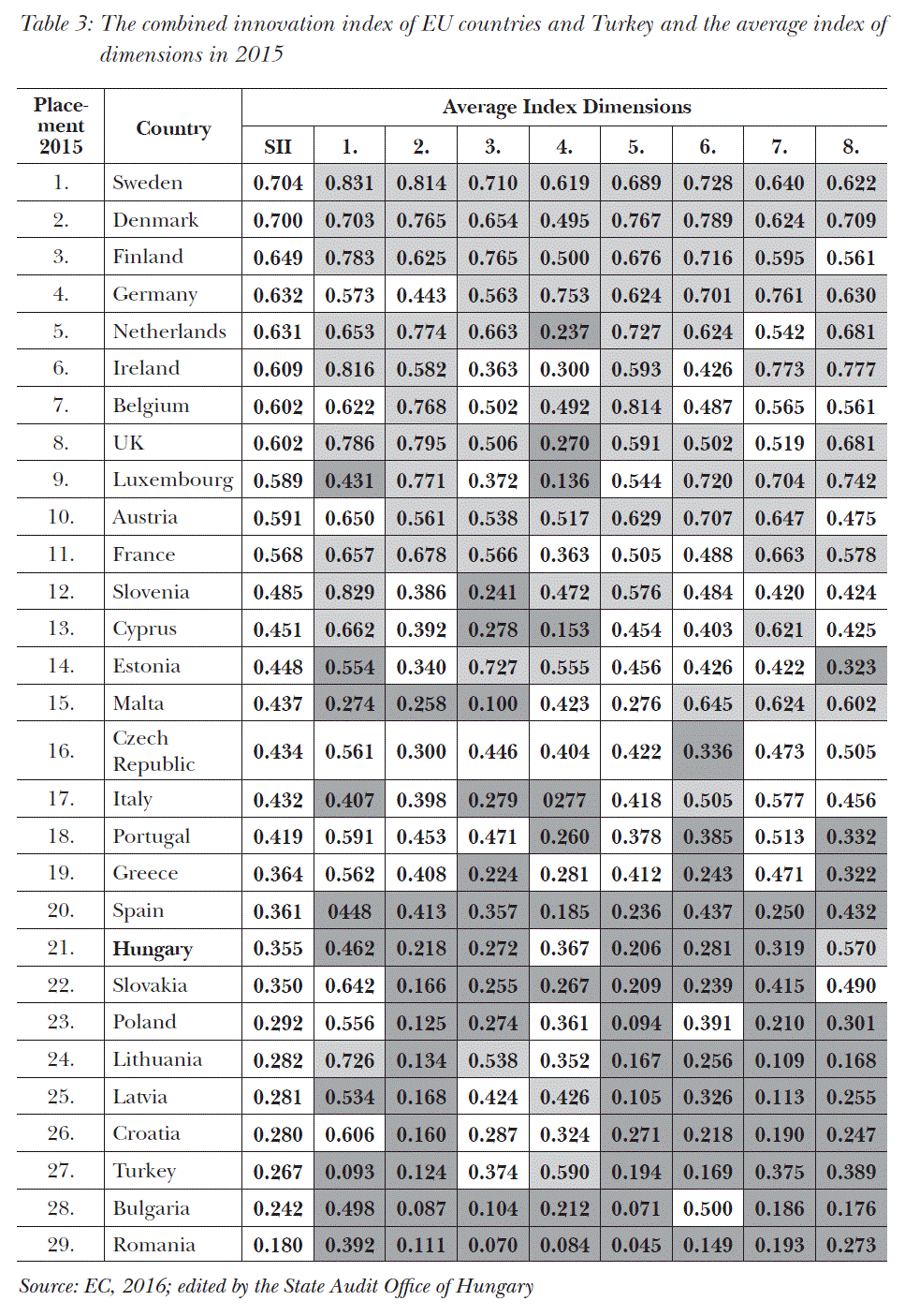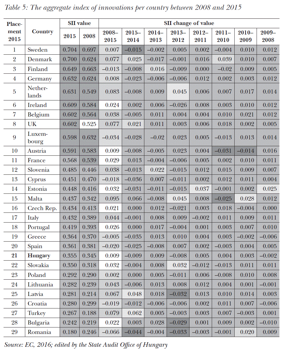 The summary table show the ranking in accordance with an average innovation performance, but the detailed calculation show a far more fragmented picture with significant deviations in various ratios. The summary table provides a fair ranking, however, it could be used only partially to evaluate efficiency. To spend a higher % of GDP on R&D, or having an elevated ratio of people with higher education of the population, or the increase of the number of small and medium-sized business in the economy do not mean the increase of innovation performance, but there are other factors to be taken into consideration (e.g. number of researchers, renumeration and other incentives, etc.).