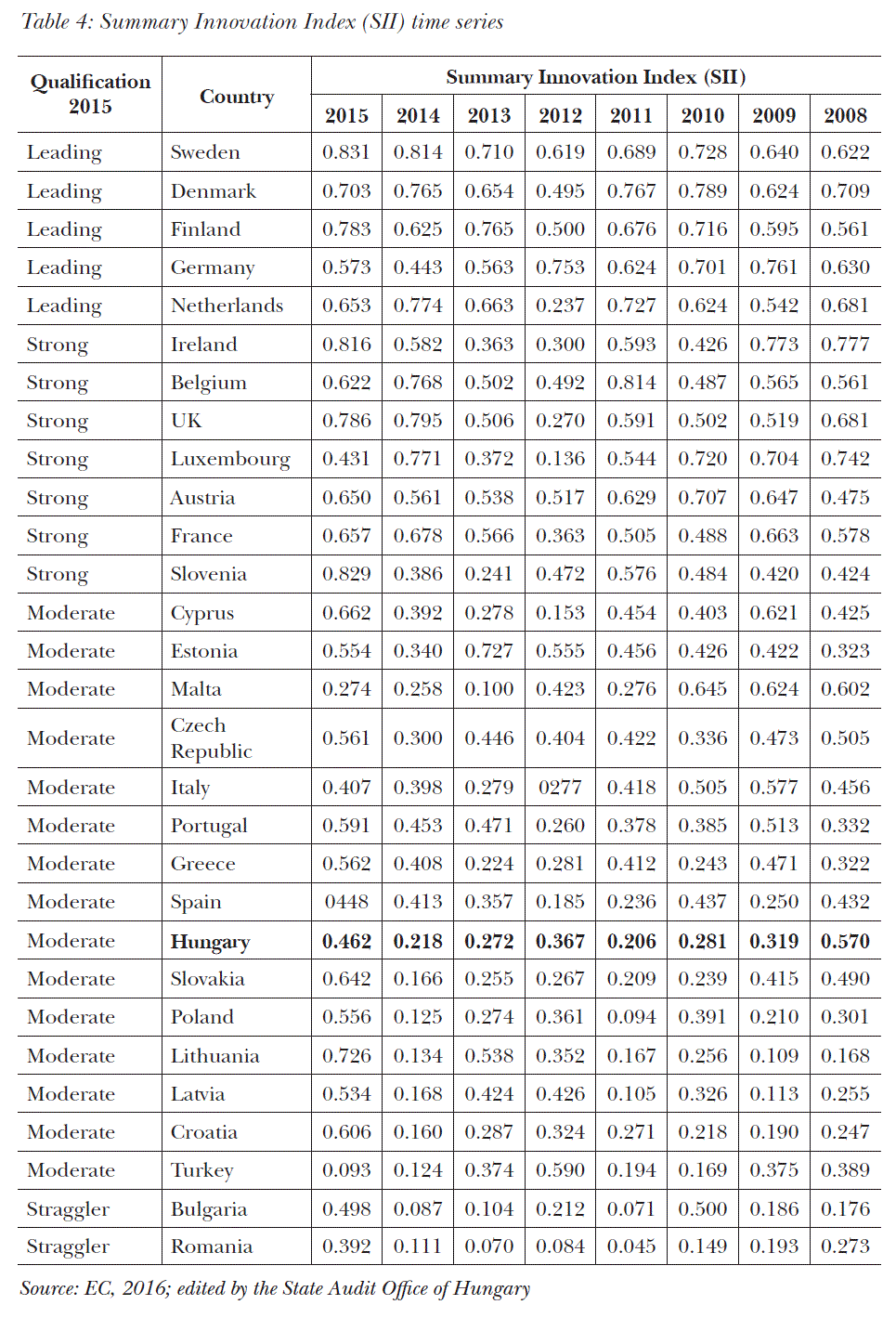 Hungary have been a very moderate innovator throughout the period between 2008 and 2015 (the performance increased only by 0.009).