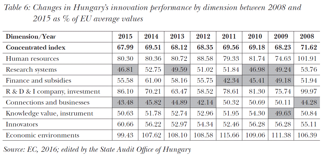 In Table 6, the dark color indicates the areas where the Hungarian results are under 50% of the EU average over the 8-year period. These cells of the table in most part of the 8-year period clearly show that the performance of Hungary in R&D+I activities are under the EU average in the following categories: Research systems; Finance and subsidies; Connections and businesses.