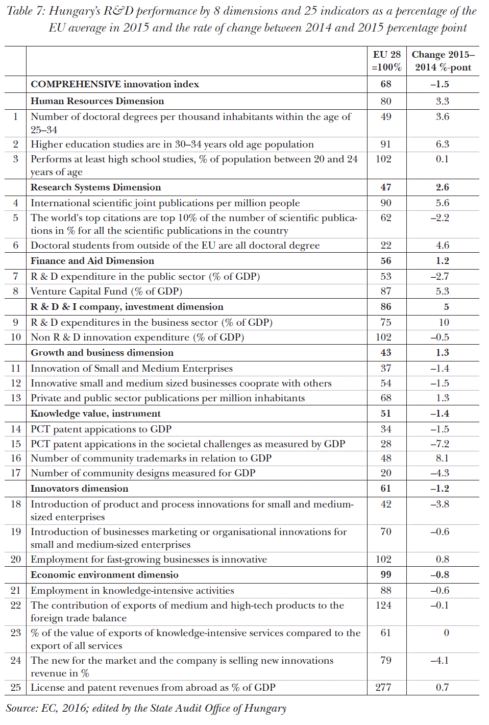 Table 7 indicates clearly that in 2015, Hungary had only one index where it outperformed the EU average (the licence and patent rights income from outside of Hungary in the percentage of the GDP). Compare to 2014, there was a minimal increase, therefore it was not a one-time result.