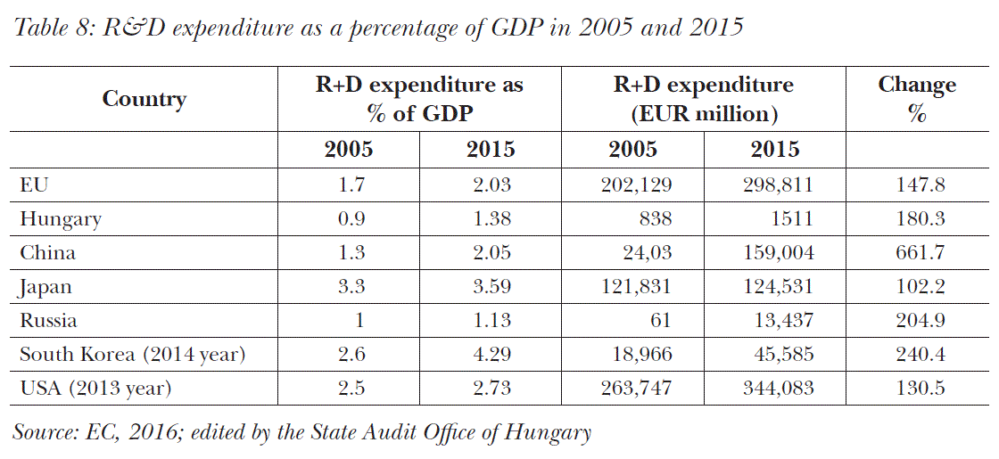 In Europe, the R&D spending lack behind compare to its global competitors, the USA (2.73%), Japan (3.59%), and significantly short relative to South Korea (4.29%). At the same time, Europe has a level similar to China (2.05%) and much higher than Russia (1.13%). In nominal value only the USA spend higher amount on R&D, than Europe. In Hungary, the level of increase compare to GDP is significant, about 80% expansion over the 10-year period between 2005 and 2015 (the EU had 47.8% increas on average for the same period, see Table 8).