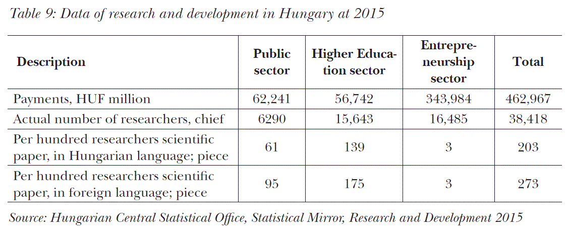 In accordance with a linear projection, there is a need of very serious efforts to achieve the original R&D+I targets for both Hungary and the EU. In Hungary, the increase is thanked to the dynamic expansion of the business sector. The higher education had/has very limited resources (represents only 0.2%) which is the 25th place in the ranking of EU countries. The research activity is considerably influenced by the lack of research institutions and researchers, which show a strongly declining tendency. There were 1400 places in 2015, which is 300 less than in previous years.