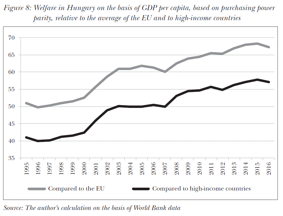 The Figure 7 shows that in Hungary the living standard exceeds the world average, and in the post-2009 period, as a realistic goal, a certain level of convergence to the EU average and to the high-income countries has also been achieved. However, it is important to note, that Hungary’s position has been weakened compared to Central European and Baltic states with similar attributes, especially after 2003-2004, its accession to the EU, when Hungary fell from a regional leader to the average in welfare. Hungarian per capita GDP remains nearly 40 percent below the level of high-income countries, and about 30 percent below the EU average.