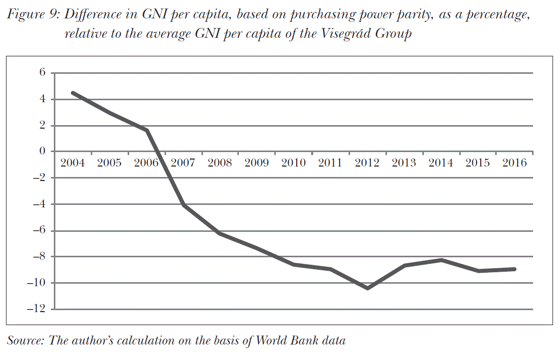 As the World Bank does not have an average indicator for the Visegrád countries, so I calculated the average GNI per capita indicator of these four countries, and the deviation is shown by Figure 9. Since GNI was not available for Slovakia prior to 2004, the analysis starts in that year. Compared to its direct competitors and partners, Hungary clear fell behind after 2005, and this trend lasted up to 2012, but Hungary remained unable to catch up with the Visegrád countries in terms of income adjusted with the primary income stream.