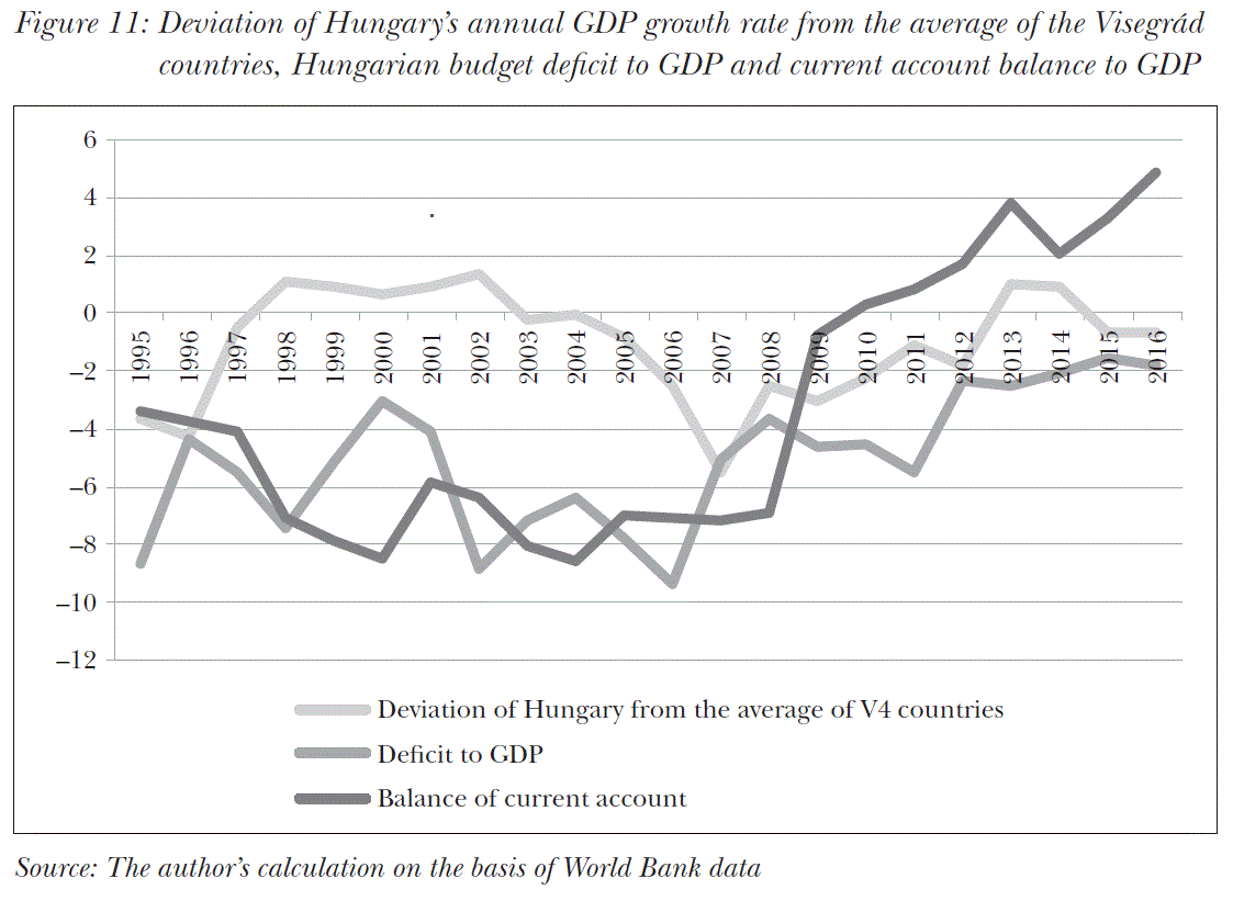 The Figure 10 shows the times when the growth rate of the Hungarian economy was above or below the average of the Visegrád countries. It is apparent that between 2005 and 2008, right after accession, Hungary fell behind the other countries in the region. However, it is also important to examine whether there was any relationship between budgetary discipline and the relative growth data on the side of fiscal policy in the given periods. The relationship between economic performance and the country’s foreign market position is also a priority area to examine.