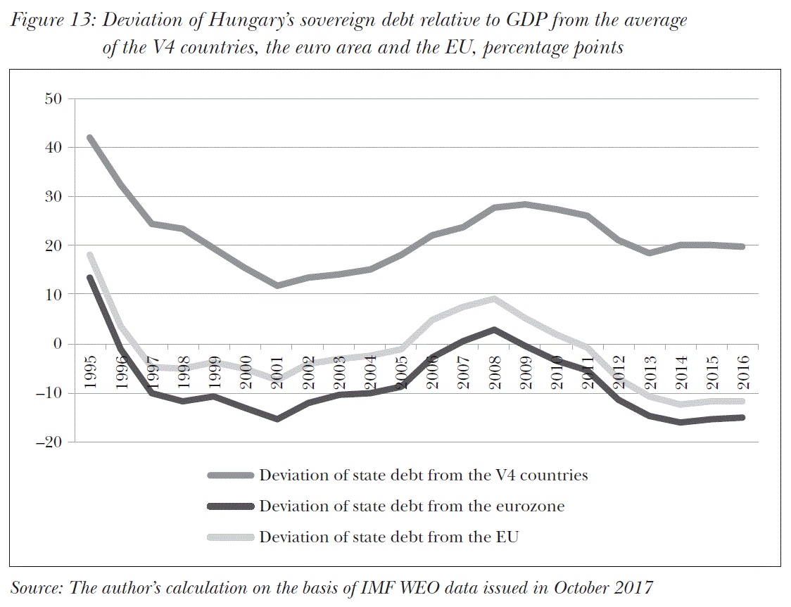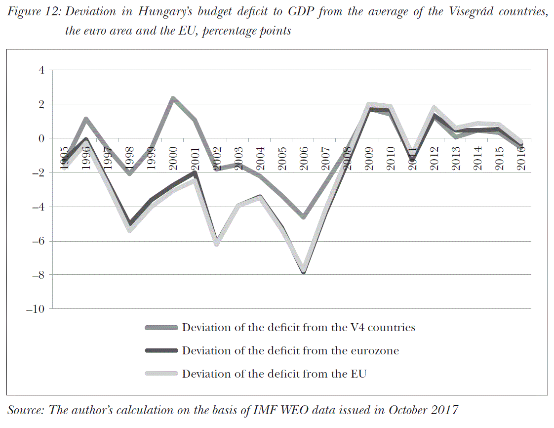 The Figure 11 points to a paradoxical situation. There was a very high deficit-to-GDP ratio in Hungary just in the period of low growth compared to the Visegrád countries. An unquestioned evidence of the incumbent government’s economic responsibility is that the economy was unable to utilize the growth-enhancing effects of the remitted budget in a regional comparison, that is to say, Hungary experienced a relative economic downturn, while the country could not keep budgetary discipline, either. Prior to the recent crisis, rapid economic growth characterised the world as a whole, including the newly acceded European countries, and thus countries could raise capital easily. After the crisis, Europe has never again recovered to a rapid growth, perhaps with the exception of Poland and Romania, in this chronological order. In absolute terms, after 2012, Hungary overperformed, even against lower growth rates, but in this period the achievement of overperformance demanded considerably more sacrifice, as the financial and capital markets only slowly regained confidence in the Hungarian economic policy under pressure. That said, the 2010 change of government and economic policy clearly had a positive impact on Hungary’s development. Mainstream academic analyses do not even mention this fact, evidencing either ignorance or ideological rejection, both representing serious offenses with a view to the ethical criteria of scientific analyses.