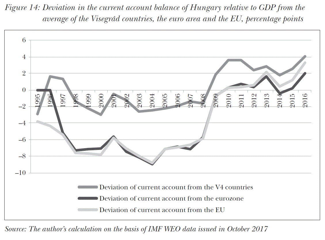 The most important indicator of trade in goods and services with the rest of the world is the balance of current account relative to GDP. A comparison with all benchmarks suggests that the current period is the most favourable in terms of Hungary’s position: in 2016, the current account position exceeded the corresponding figure of the euro area by at least two percentage points, and of the Visegrád countries by four percentage points. In this respect, membership in the EU could have a very positive impact on the trend, as it is Hungary’s most important export market. Naturally, it is a question whether this performance is only temporary or the result of the weakening forint, and yet this has been the greatest macroeconomic achievement since the country’s accession to the EU, and a success achieved especially in the years after 2010.