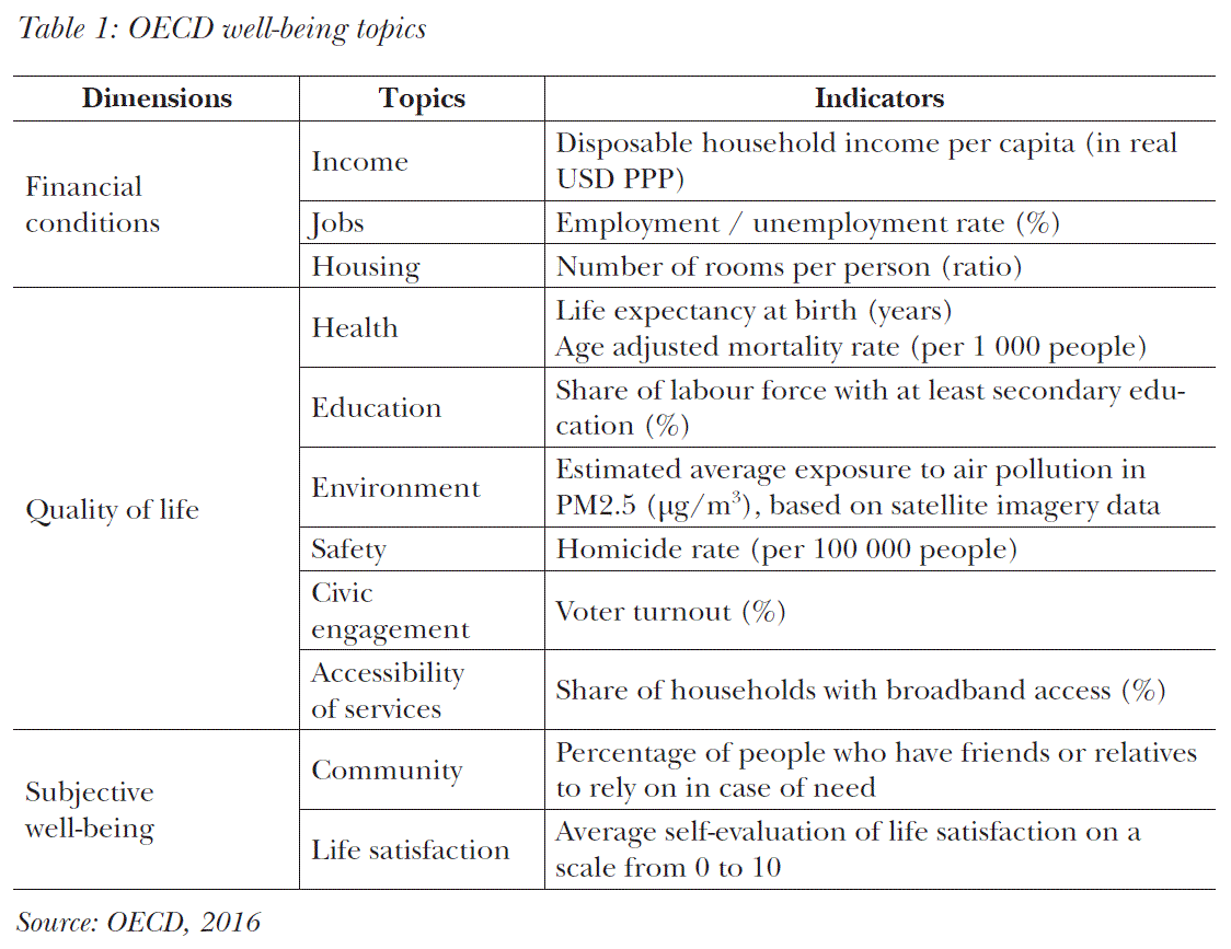 Measuring well-being is indispensable when place-based governmental policies are considered for development. Measures of well-being can help policy makers to enhance the design and targeting of regional policies. They can also empower citizens to demand placed-based policy actions that respond to their specific expectations. The OECD conceptual framework for measuring well-being is considering both on individuals and on place-based characteristics (OECD, 2016). It starts with the consideration that making better policies for better lives means understanding what matters to people. Its questions are: “What do people perceive and value about their local conditions? How do they behave when they are not satisfied with one aspect or more of their life? Do local inequalities in the accessibility of services matter in shaping citizens’ choices and do they have an impact on national well-being? How much does the place where we live predict our future well-being?”
