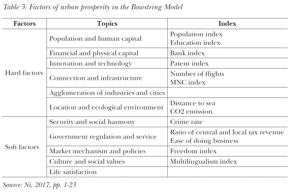 A city’s ability to create value is manifest as the comprehensive long-term growth in the urban economy and the economic density, and depends on the conditions of a city’s elements and environment. Ni (2017, pp. 1-23) has built the Bowstring Model to analyse the driving factors of urban prosperity, as measured by hard and soft factors of prosperity.6