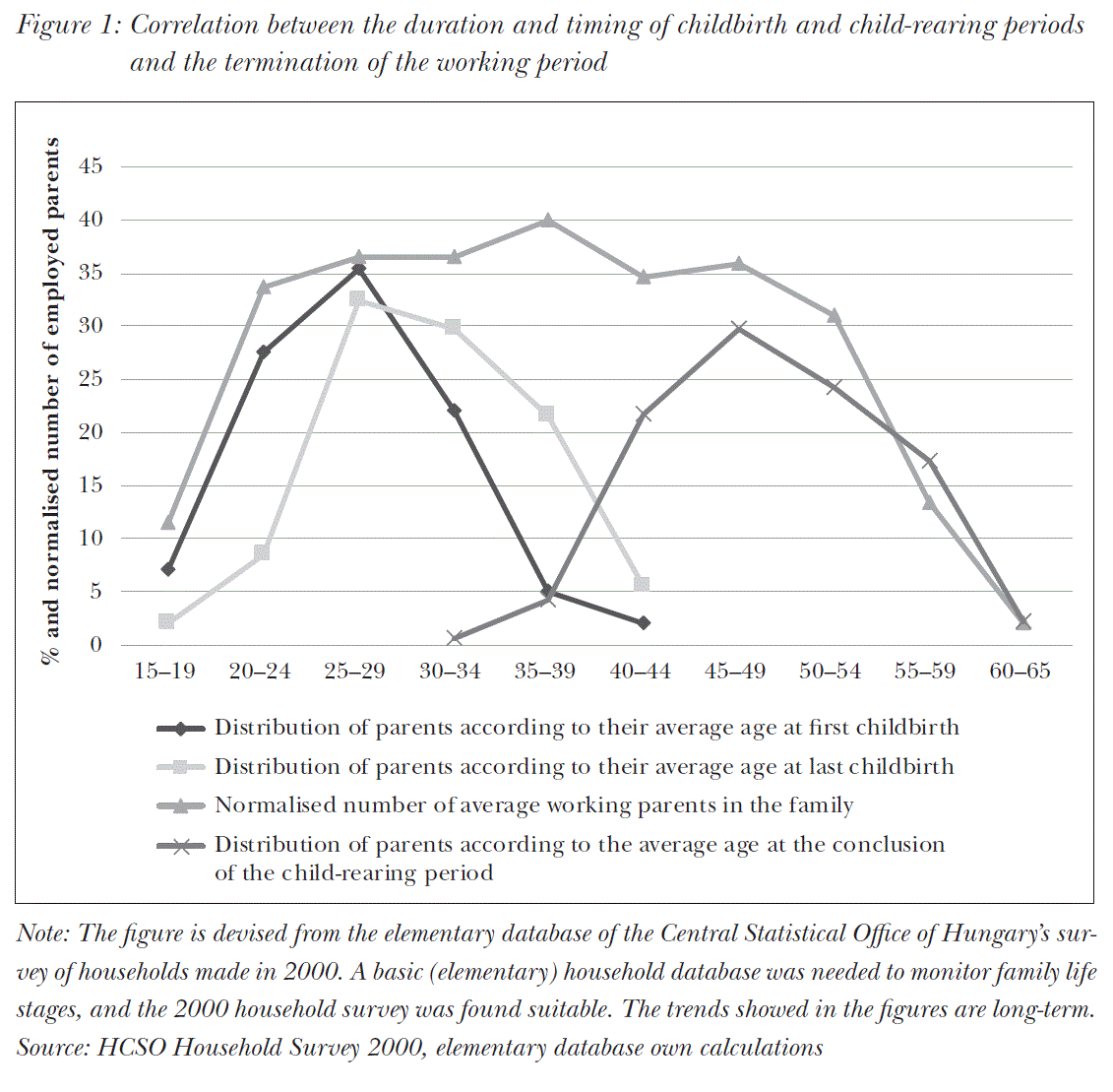 The Figure 2 shows that the fall of the work distribution line along the age of the parents is also very similar to the fall in the reproduction lines. This means that the last child, the youngest one in the family, is typically dependent when the parents are often made redundant from the workplace in a very sudden way. (Recently, the conflict between demography and work has become considerably milder than it was in the beginning of the 2000’s, but there are signs of a new conflict evolving between a more intensive female career life stage and childbirth timing.) Figure 2 shows the distribution of parents according to child-rearing age.7 This is the age at which the youngest child reaches 20. The line shows that the number of parents in child-rearing age is still growing when they are made redundant from the workplace.