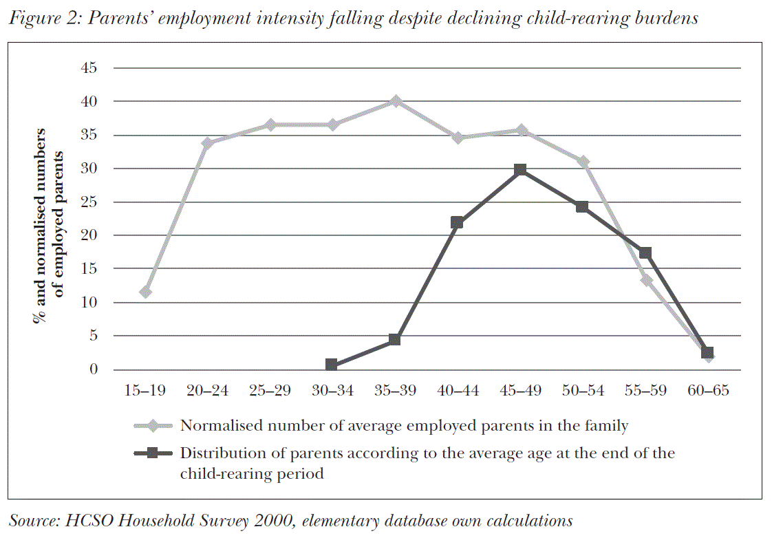 2) A significantly curtailed employment period. The negative effects of the conflicting timing of the reproduction and employment periods are aggravated by a considerably difficult employment period. This means that while families with small children are often overburdened by employment, mature families (families with teenage children) are more likely to be underemployed, although they are less constrained by family duties.
