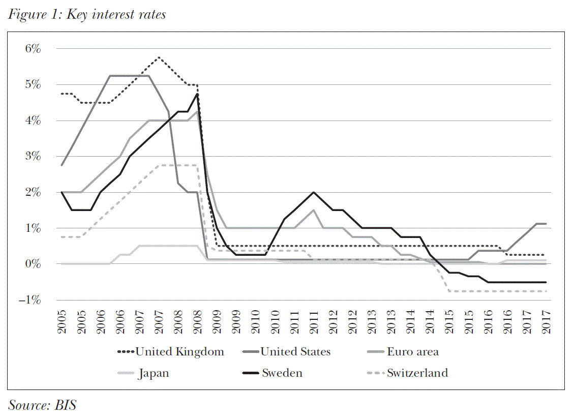 The depth and the global spillovers of the crisis required novel and complex measures both in monetary policy and regulation. The main objectives of the monetary policy had to be reconsidered. It became clear that price stability alone was not enough to ensure the stability of the financial system (Kolozsi and Hoffmann, 2016). The role of macro-prudential policy has appreciated (Ábel et al., 2014). Real-economy targets such as the reduction of unemployment and the promotion of economic growth have become more pronounced. Short-term interest rates, which were formerly the main tools of monetary policy, hit the zero lower bound. In countries like Switzerland, Sweden, or Japan, central banks experimented with negative interest rates but were cautious about the uncertain consequences of negative rates on financial and macroeconomic developments (see Figure 1). This also meant that central banks had essentially lost their number one and best known instrument in conducting monetary policy.