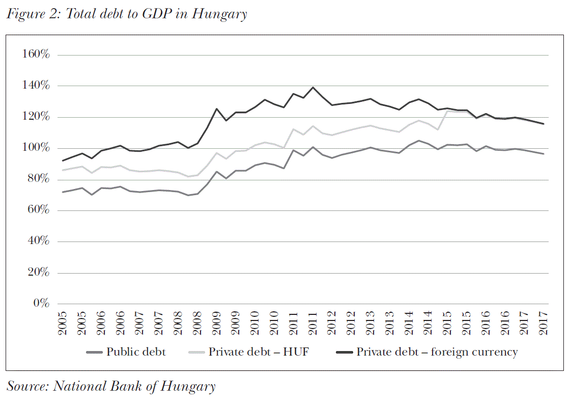 The crisis hit Hungary in a particularly vulnerable state. The economic growth before 2006 was unsustainable, the high budget deficit (Orbán and Szapáry, 2006) (the country was subject to the excessive deficit procedure since 2004) has significantly increased the total debt of the country. Both the public and the private sector has increased its indebtedness materially. The external financing requirement was high, which was boosted not only by the public overspending, but by the high volume foreign currency retail lending as well (Matolcsy and Palotai, 2016, see Figure 2). The country was also running on a high current account deficit. And, though the reforms of 2006 were able to bring the very high public deficit to lower levels, current account deficit remained high, so external imbalances remained, and the cuts in public spending significantly dampened both the potential and the actual GDP growth rate of the country. These negative tendencies were also amplified by the pro-cyclical banking sector.