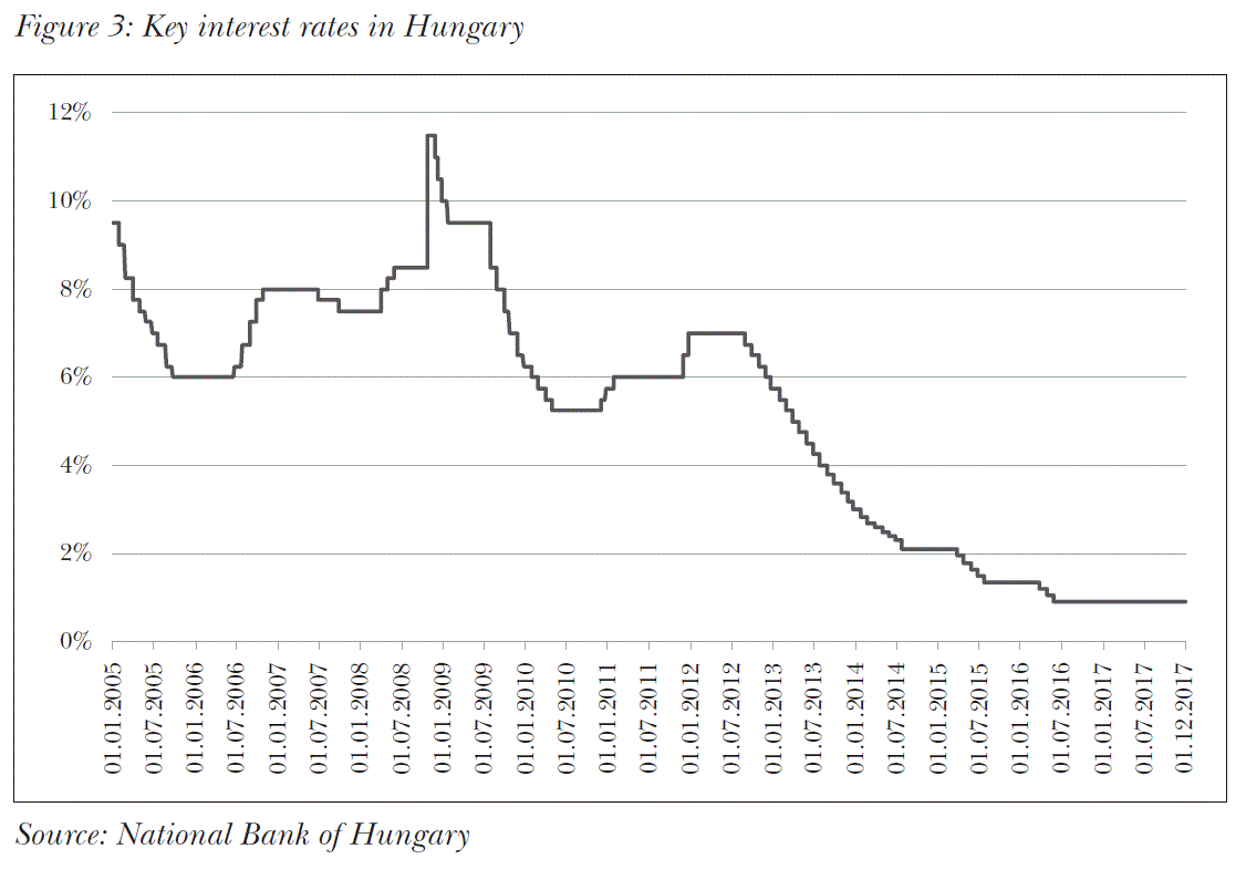 The monetary policy turnaround had multiple steps. The base rate was materially reduced in three easing cycles, from 7% to 0.9%, by 610 basis points in total (see Figure 3). This has significantly reduced the interest burdens of both the public and the private sector. The National Bank of Hungary introduced its targeted lending incentive instruments, the Funding for Growth Scheme (FGS), and the Market-Based Lending Scheme, which actions helped to kick-start the SME lending in the country (Baksay and Palotai, 2017), which has been in decline since 2009 (Banai, 2016). The National Bank of Hungary has developed and launched its Self-Financing Programme, a mix of actions with the objective of decreasing the external financing requirements of the country. This measure helped to cut the ratio of foreign currency debt to public debt from 50% in 2011 to 25% in 2016 (Baksay and Palotai, 2017). The Central Bank was also a key player in the conversion of the substantial foreign currency denominated household debt to Hungarian forints. In the absence of this action, many people would have lost their homes and the country would have faced irreparable and significant social losses on 15 January 2015, when the Swiss National Bank unpegged the CHF from the EUR. As majority of Hungarian private mortgages were denominated in Swiss francs, the massive strengthening of the Swiss currency would have materially increased the debt burden of the domestic debtors.