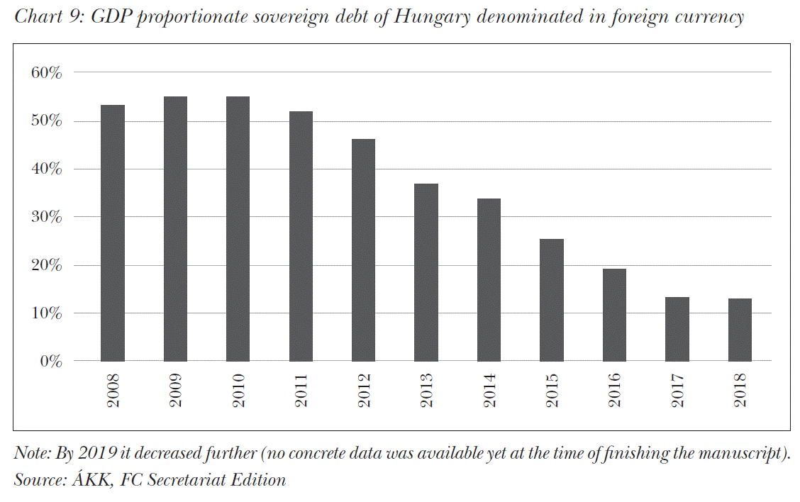 - As a result of multiannual efforts it could be stated that in the course of the past years the share of foreign currency denominated debt within government debt exceeding 50 percent in the years of 2010 has decreased by the end of 2019 to approximately 10 percent and has significantly contributed to the mitigation of the external vulnerability of the county.