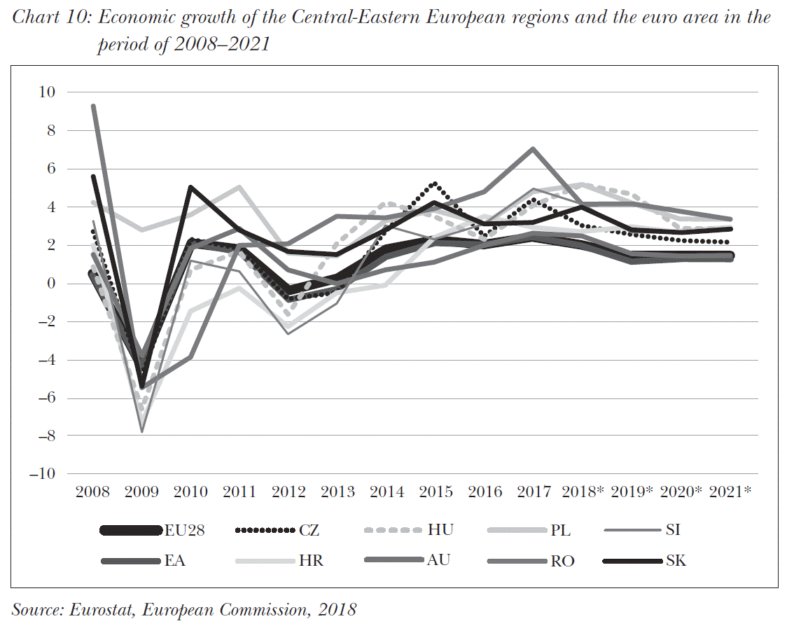The economic growth determining public finance stability has been present ever since 2013. We should emphasise that years 2014 and 2015 were the first two years ever since the early 90s when Hungarian economy was able to grow in such way that the growth was not followed either by the growth of sovereign debt or that of the external indebtedness of the economy. It is favourable that economic recovery is gaining strength and the economic growth of the region is exceeding the average of the euro area (see Chart 10). As regards the chart, we should note that the expansion of the Hungarian economy in 2018 reached 4,9–5 percent that exceeded by far the last forecast of the European Commission (2018) and the data from 2019 is similar to this. As regards the following years it is likely that the Hungarian economy will perform above the average of the EU, in the area of 3–4 percent.