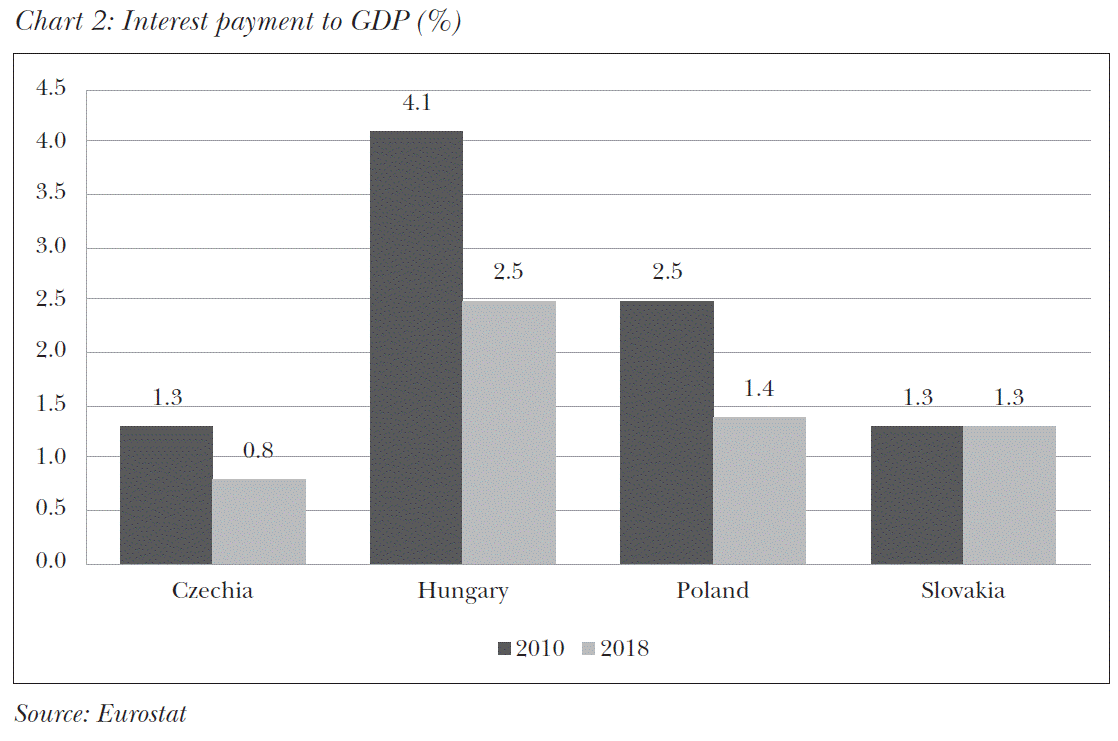 In addition to the government debt to GDP, it is also important to examine a coun-try’s spending on interest each year, as it demonstrates the actual cost of public debt. According to the Eurostat data, in Czechia, the interest paid by the budget fell from 1.3 to 0.8 per cent of GDP between 2010 and 2018. Over the same period, interest expenditures fell from 2.5 to 1.4 per cent of GDP in Poland and from 4.1 to 2.5 per cent in Hungary. In Slovakia, despite increase in public debt, the interest rate to GDP remained unchanged. Reduction in interest is extremely important for governments, as it allows use of the available resources for economy development, increases competitiveness and improves welfare through social benefits.
