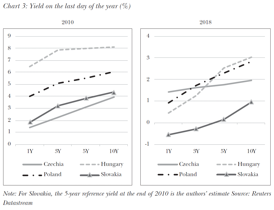 While in Slovakia yields were still between 1.8 and 3.8 per cent on the one-year and five-year maturities at the end of 2010, on the three-year maturity they went into the negative at the end of 2018, but at the maturity of five years, yields were also at a minimum 0.15 per cent. The ECB’s monetary policy, which had a direct impact on Slovakian yields and an indirect one on the other yields in the region, played a key role in creating negative yields in Slovakia. The ECB’s base rate was still 1.0 per cent at the end of 2010, which then gradually decreased to 0 per cent. Besides, the ECB’s bond purchase programme had a significant impact on bond yields. From July 2009 the ECB implemented asset purchase programmes, but the Public Sector Purchase Programme (PSPP), the most significant one of all, only started in March 2015. In the PSPP the ECB buys government bonds issued by the Member States of the euro area, as well as bonds issued by acknowledged agencies, regional and local governments, international organisations and multilateral development banks. Within this framework, the central bank bought bonds for more than net EUR 2170 billion at the end of 2018, of which nearly 90 per cent were government bonds issued by Member States. This had a significant impact on yields at the long end of the yield curve. In the case of Slovakia, the European Central Bank had bought Slovakian state bonds for nearly net EUR 11.7 billion in the framework of its asset purchase programme by the end of 2018, which represented 26.5 per cent of the country’s public debt in 2018. As the other three Visegrád countries are not members of the euro area, they were only be indirectly affected by the asset purchase programme through the rearrangement of investor portfolios. However, the Slovakian 5-year CDS spread was still the lowest among the Visegrád countries (83 basis points) partly also because of the euro area membership, and then it decreased to 48.58 basis points. Consequently, besides the favourable yield environment, improvement in Slovakia’s perception has also contributed to decline in yields.