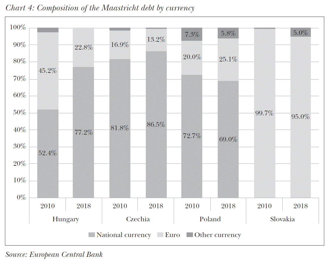 After a presentation of the evolution of public debt in the surveyed countries, developments in the main structural indicators between 2010 and 2018 are described on the basis of the “original sin” concept, coined and elaborated by Eichengreen and Hausmann (1999) and Eichengreen et al. (2002). This is to assess the extent the countries of the Visegrád Group are prepared for a possible future crisis and the adverse effects of a low level of preparedness on debt.