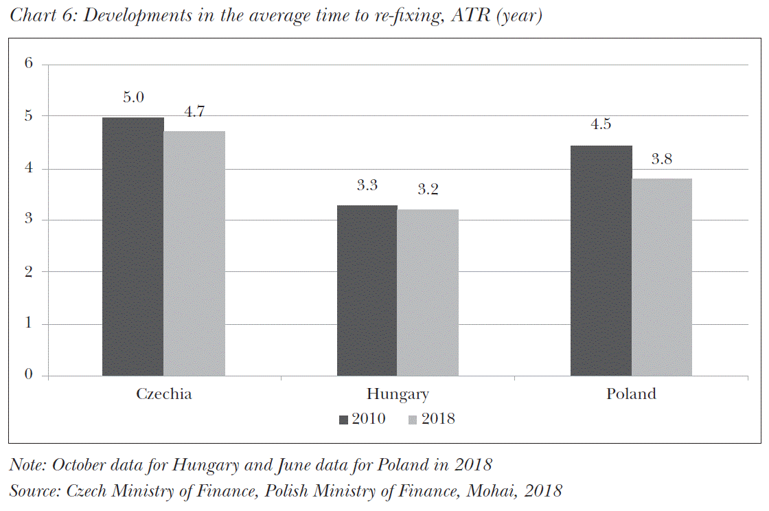 A similar picture emerges for the ATR: the Czech indicator declined from 5.0 to 4.7 years, exceeding the 4-year target set by the government debt manager. The value of the Hungarian indicator decreased from 3.3 to 3.2 years, while the Polish indicator fell from 4.5 to 3.8 years.2 In other words, the interest rate sensitivity of public debt portfolios increased slightly during 8 years under review in the three countries. However, the Slovakian government debt manager does not provide data on the ATR. This is mainly due to the fact that the government debt it manages is fully fixed, i.e. the repricing of floating rate bonds in Slovakia is not a risk when interest rates increasing.