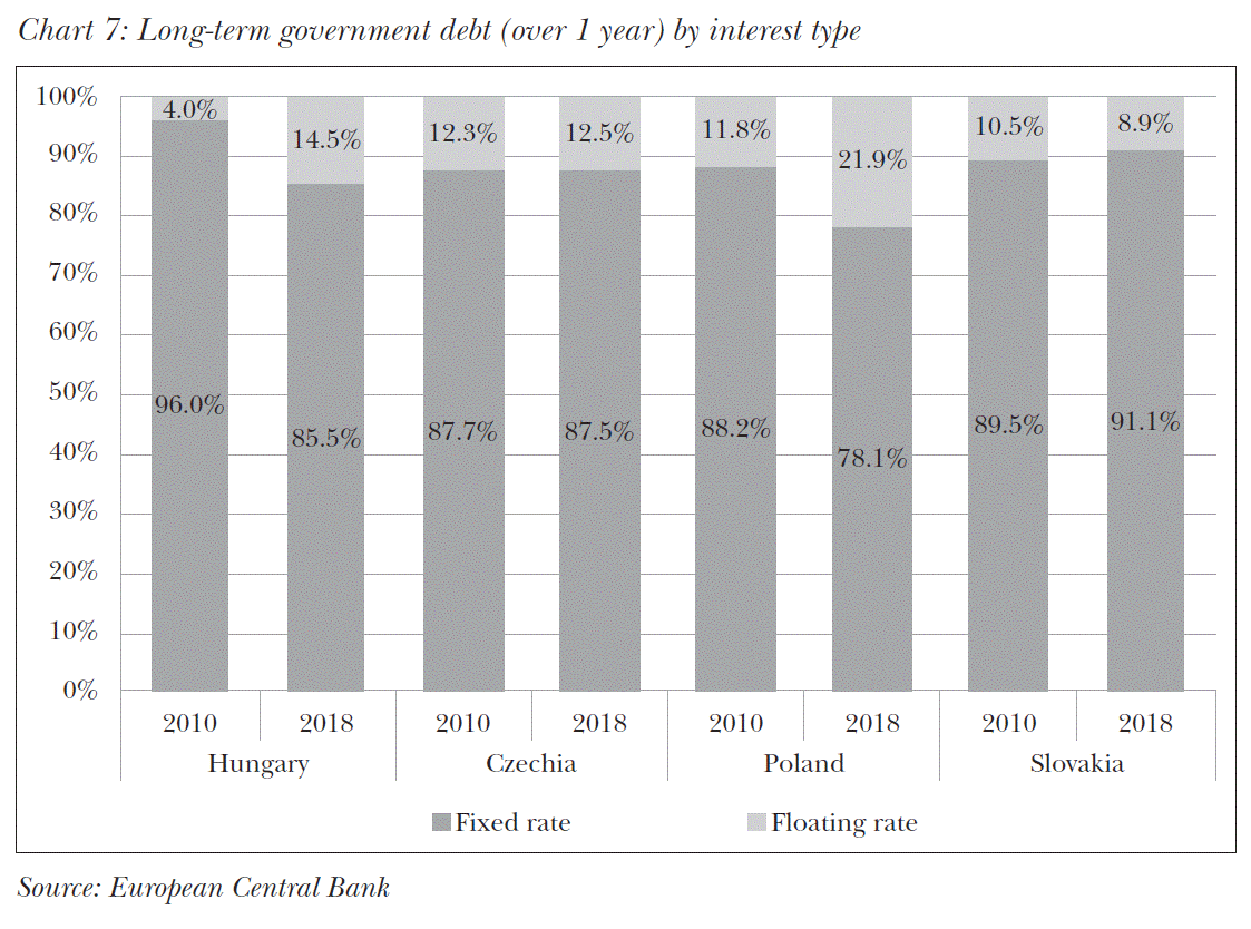 The role of floating rate government securities is marginal in the region. Between 2010 and 2018, there was a slight decrease in Slovakia, while in Czechia the role of floating interest stagnated within the Maastricht public debt: in both economies, around 10 per cent of the government debt with maturity of over 1 year had floating interest rates. In contrast, in Hungary and Poland, the role of floating rate government securities increased significantly, by more than 10 percentage points, and as of 2018 more than one-fifth of long-term Polish debt had floating interest rates.