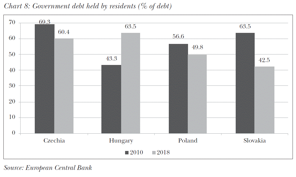 The third original sin is indebtedness to foreign investors. In this respect, only Hungary managed to secure a more favourable position during the reviewed 8 years, primarily due to the encouragement of household participation. In Slovakia and Poland, however, opposite developments have taken place: majority domestic ownership recorded back in 2010 has been replaced by foreign majority, and the role of nonresidents has also increased significantly in Czechia.